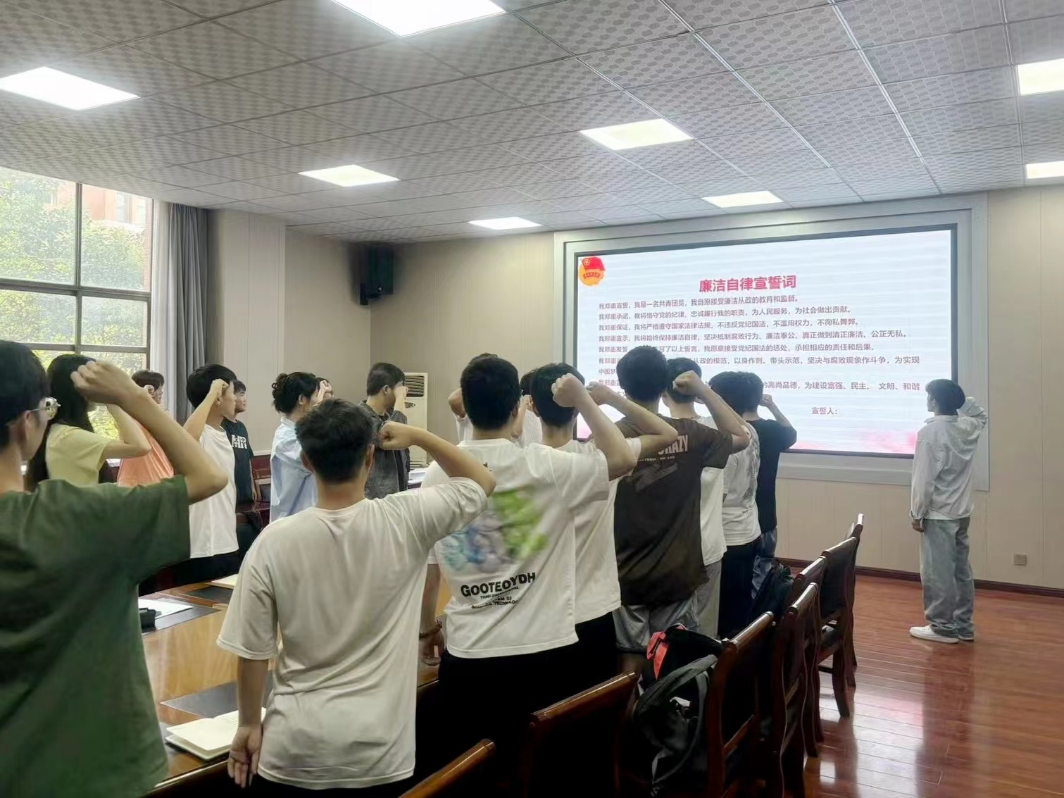 活动伊始,由邱承奎向各位代表介绍本次活动的流程及注意事项,接着由组织部干事为代表们分享廉洁故事,在提高代表们对廉洁之风深刻感悟的同时,更激励着大家成为廉洁美德的坚守者与践行者。在廉洁自律誓词的宣誓环节中,代表们眼神坚定、声音洪亮,大家纷纷表示要在社会实践中学纪、知纪、明纪、守纪,不忘初心廉洁行事,为打造廉洁的社会风气贡献自己的智慧力量。