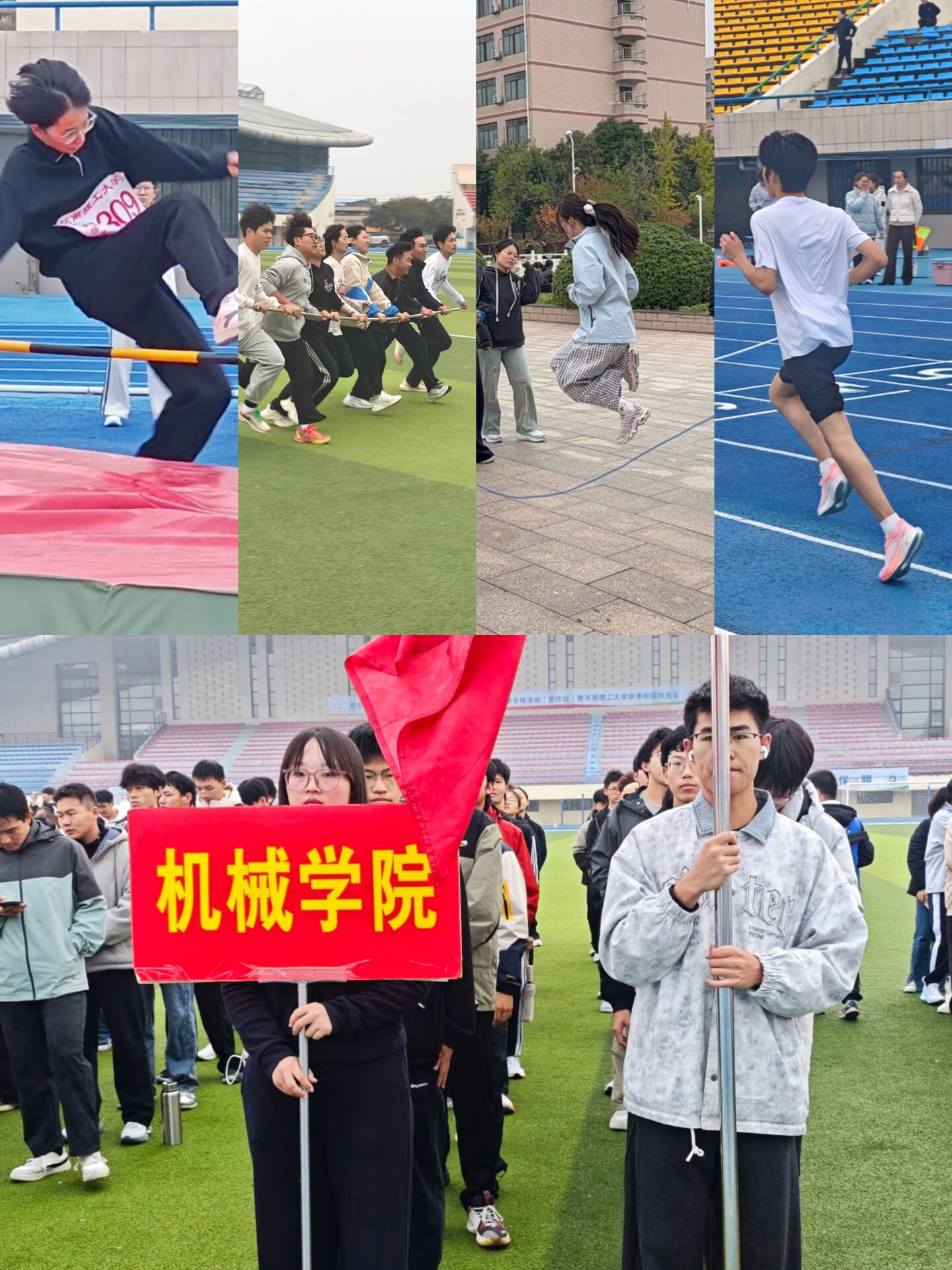 大家在赛场上团结协作、奋勇争先,展现了机械学子良好的精神风貌和昂扬的拼搏斗志。 运动场上,机械健儿们的身影成为一道道亮丽的风景线。在个人项目中,李嘉怡同学在竞争激烈的女子400米栏比赛中不畏强手,最终荣获第八名。李佳仪同学在女子跳高项目中发挥稳定,姿态优美,取得了第五名的好成绩,赢得了现场观众的阵阵喝彩。集体项目更是考验团队默契与协作精神的舞台。在备受关注的20×50米接力赛中,机械学院的运动员们配合默契,接力流畅,最终斩获第六名。跳绳接力项目的队员们身轻如燕,节奏一致,同样取得了第六名的优异成绩。尤其在趣味性与协作性并重的“旋风跑”项目中,队员们步伐统一,行动迅捷,配合无间,最终勇夺第四名,充分体现了机械学院强大的团队凝聚力。