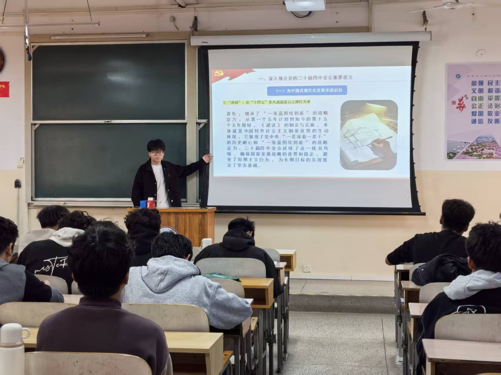 在专题学习会上,各团支部书记首先带领成员学习了习近平法治思想中“坚持党对全面依法治国的领导”“坚持以人民为中心”等重要论述。随后,活动从“法治体系是科技创新的制度保障”这一关键点切入,引出并重点学习了党的二十届四中全会关于“加快高水平科技自立自强”、“建设制造强国”等重大战略布局。最后,团支书通过发展实践案例,将经济、民生、生态、安全等领域的政策要求与青年责任相结合,引导同学们把握“理论学习—战略认知—实践担当”的逻辑链条,切实把“强国有我”的信念转化为专业报国的实际行动。