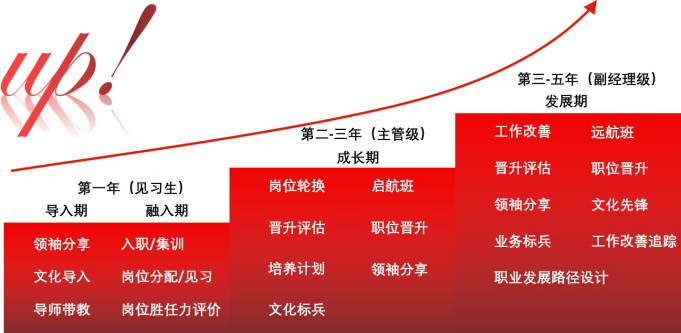 Ø 完备的培养体系:从集训-导师制-轮岗-定岗,每阶段配备导师带教,快速融入企业文化,提升职场技能;