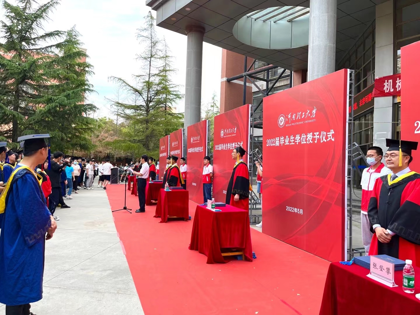 5月31日上午,我院在院楼前广场搭台布景举办了2022届毕业生学位授予仪式,院党委书记聂凯、院长张新民、党委副书记许荣梅、副院长焦锋、明平美、张登攀出席了仪式,并为获得学士、硕士、博士学位的877位毕业生和在校留学生代表一一颁发了学位证。学院机关各科室工作人员同2022届毕业生一起参加了仪式。仪式由教科办主任魏绍亮主持。