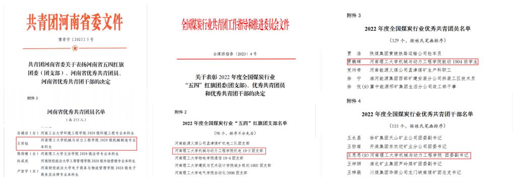 近日,共青团河南省委印发《共青团河南省委关于表扬河南省五四红旗团委(团支部)、河南省优秀共青团员、河南省优秀共青团干部的决定》([豫青字2023]5号)、全国煤炭行业共青团工作指导和推进委员会印发《关于表彰2022年度全国煤炭行业“五四”红旗团委(团支部)、优秀共青团员、优秀共青团干部的决定》(全煤团指委[2023]4号),评选表彰了2022年度河南省、全国煤炭行业先进基层团组织、优秀共青团干部和优秀共青团员,我院1个先进集体和3名先进团员青年获得表彰。