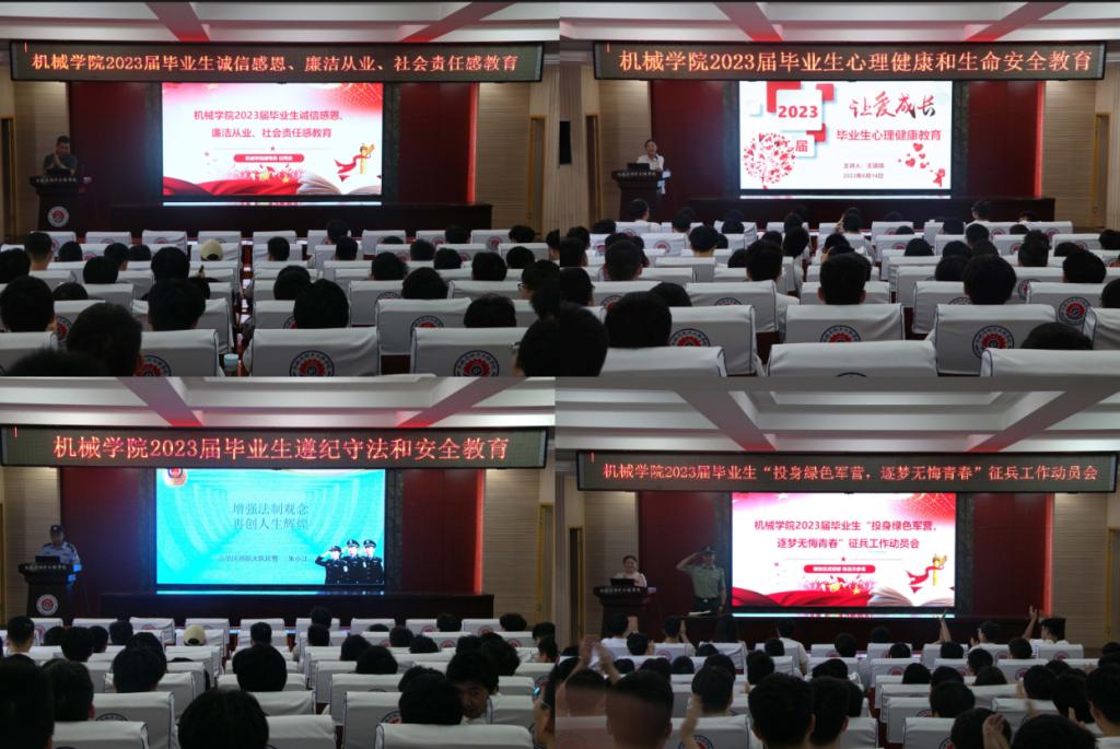 会议邀请五位校内外专家、教师主讲,在该院205、305、101、102四个教室分五个场次进行。王帅以“党史学习教育、爱国主义和理想信念教育”为主题,结合二十大作出的重大战略部署,引导毕业生坚定理想信念、涵养家国情怀、砥砺奋斗精神,以良好的精神风貌和饱满的工作热情走出校园、迈入社会,为未来中国发展汇聚青春力量;我院学生资助专员任秀安通过分析实际案例,倡导毕业生要有社会责任感,要做诚信之人,常怀感恩之心,要有“廉洁自律,坚守底线,脚踏实地,成才立业”的思想觉悟,努力成为新时代中国特色社会主义事业优秀的建设者和接班人;示范区巡防大队民警朱小江,针对毕业季学生在就业创业方面所遭遇的各种“套路”,提醒毕业生一定要多听,多学,多思考,多总结,谨防生活中的各种诈骗,保护个人生命和财产安全;我院心理辅导老师王瑞瑞针对毕业生可能产生的心理困扰,引导毕业生要学会向专业人士求助,她以通俗易懂的方式引导毕业生要珍爱生命、关爱他人、热爱锻炼、挚爱党国,做大树,成栋梁,做溪流,向大海,让生命在关爱中健康向上绽放光芒;解放区武装部陈亚杰参谋向毕业生解读入伍优待政策,鼓励毕业生积极应征入伍,用热血青春熔铸钢铁长城,用担当奉献谱写青春华章,向新时代党的强军目标迈进。