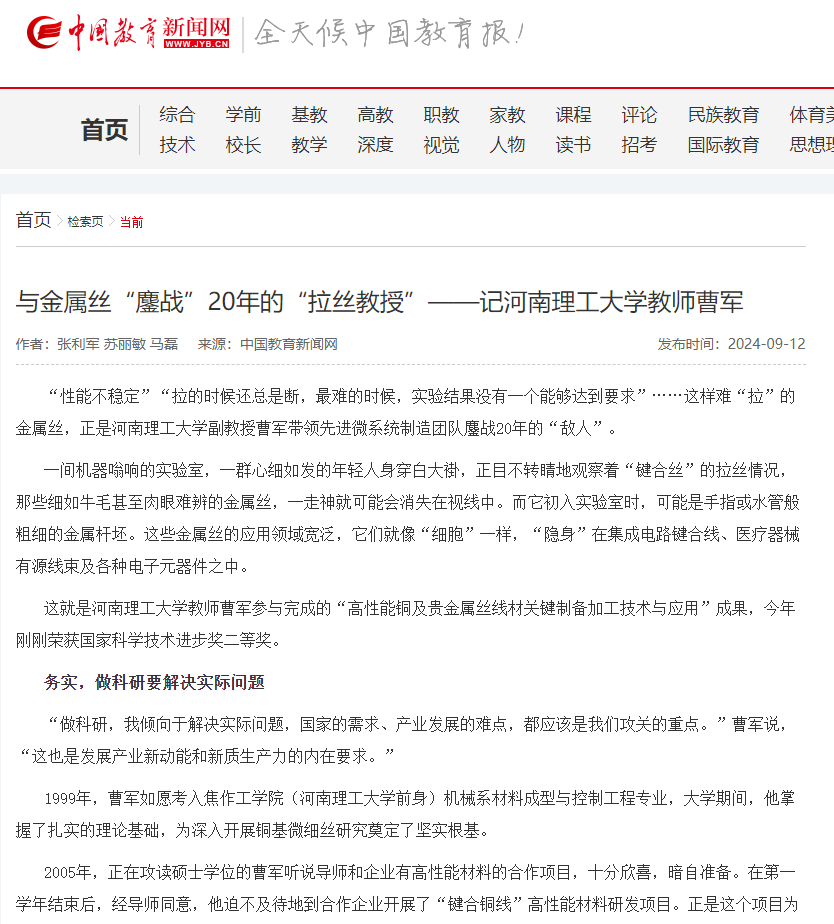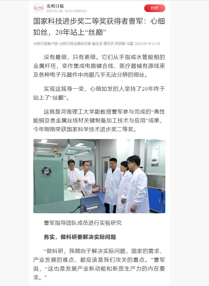 这就是河南理工大学副教授曹军参与完成的“高性能铜及贵金属丝线材关键制备加工技术与应用”成果,今年刚刚荣获国家科学技术进步奖二等奖。