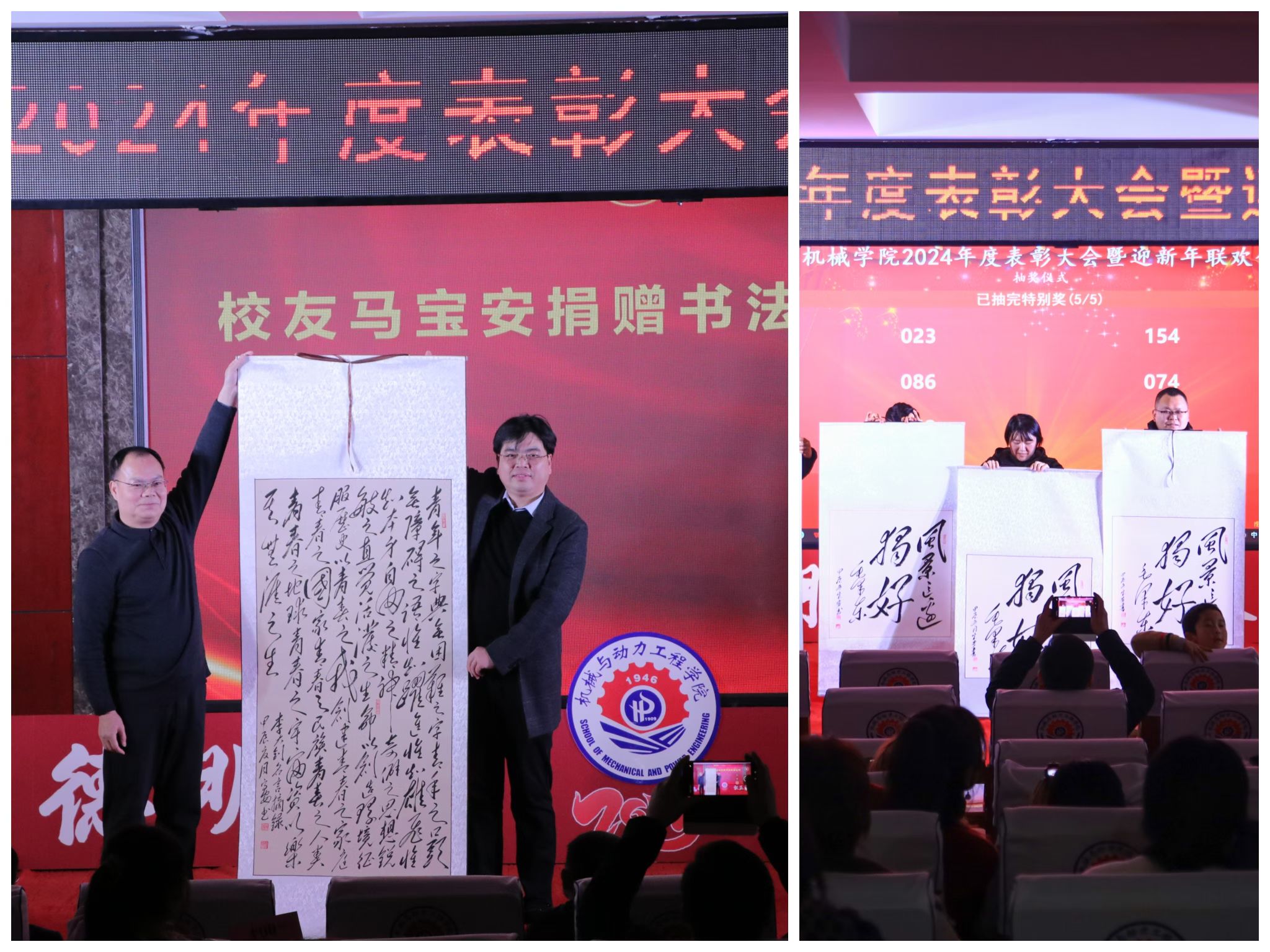 本次活动得到了山东杰创机械有限公司总经理赵恒涛校友、广东华楠骏业机械制造有限公司董事长柳雪春校友、河南角角牛食品有限公司董事长马宝安校友的倾情支持,为学院的发展注入了强大动力。校友马宝安还为学院捐赠书法作品,彰显了校友对母校的深深眷恋和美好祝愿。