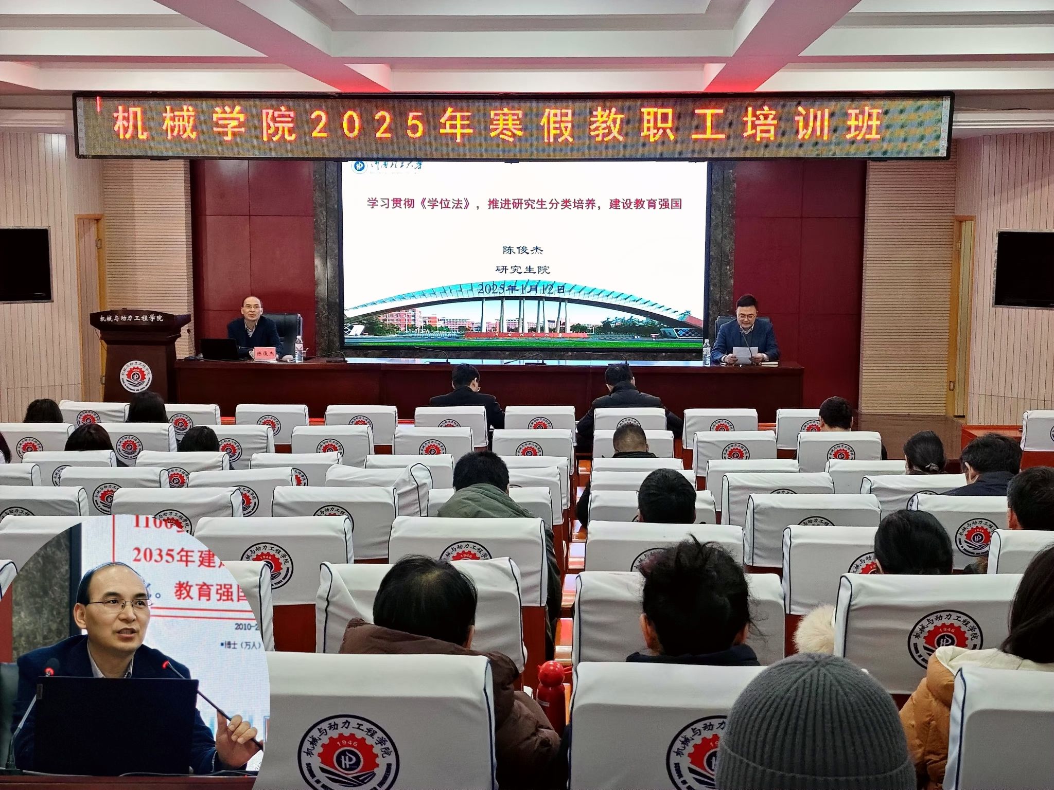 为全面贯彻落实党的二十届三中全会与全国教育大会精神,深入推进《中华人民共和国学位法》贯彻落实工作,规范学位授予工作,保障学位授予质量,1月12日,我院组织召开了《学位法》贯彻落实研讨会。会议特别邀请研究生院院长陈俊杰作题为《推进研究生分类培养,建设教育强国》的主题报告。本次会议由学院副院长张登攀教授主持,学院全体教师参加。