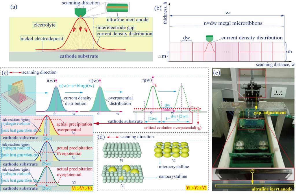 针对常规电沉积技术制备金属纳米结构材料的不足,明平美教授团队提出了一种新型电沉积技术—线阳极扫描电沉积技术(Wire Anode Scanning Electrodeposition,WAS-ECD)。该技术以超细(直径/宽度≤50μm)惰性金属丝材为阳极(线阳极),并在阴极上方极小极间间隙(≤200μm)位置往复扫描运动而实现金属电沉积。WAS-ECD技术实现了无添加剂、无脉冲电源等辅助手段下超高强度超纯纳米镍的高品质制备,制备出的纳米镍晶粒15-50nm、镍含量高达99.9997%、镀态硬度656HV、拉伸强度664MPa、断裂延伸率8.5%,兼具了高硬度、高塑性和高超纯度的优异性能。WAS-ECD技术为超高强度超纯纳米晶金属材料的制备提供了新的技术方案。