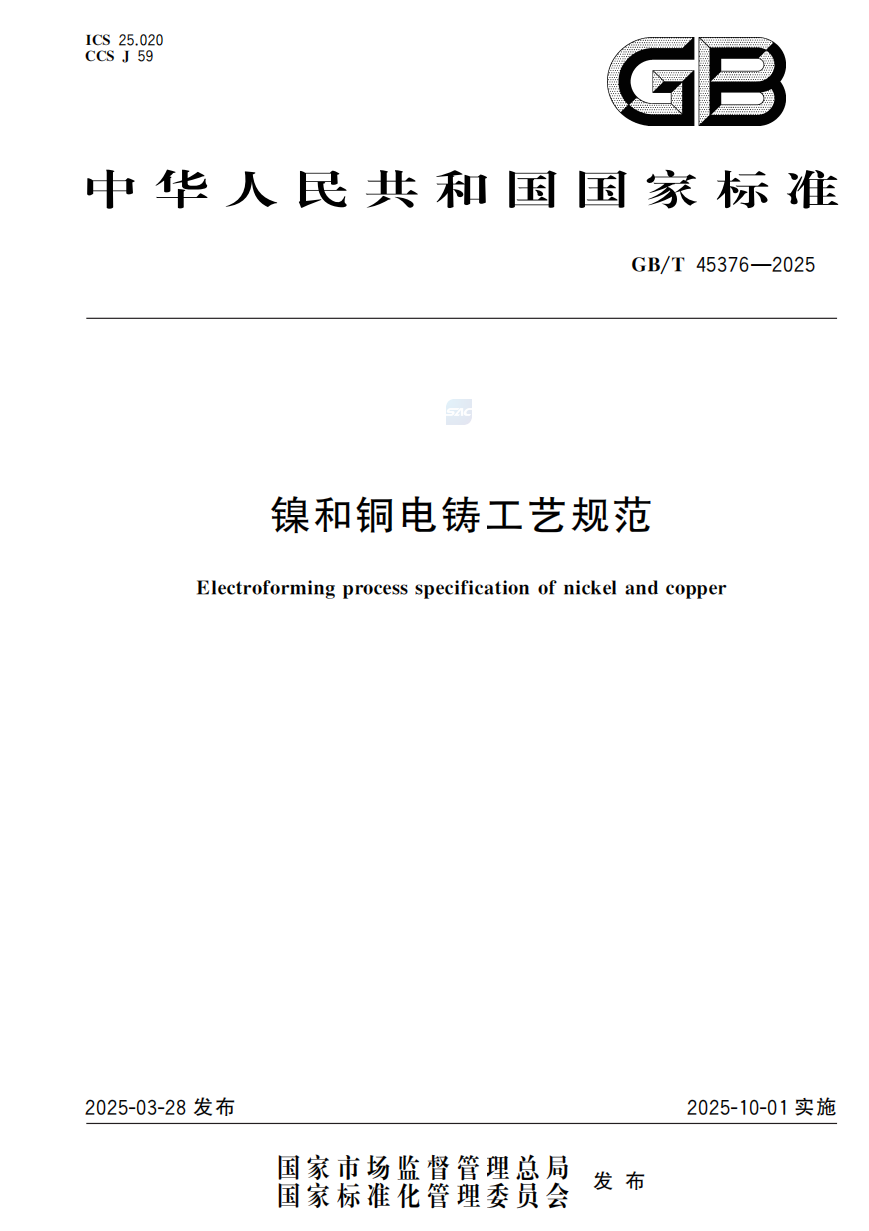 近日,国家市场监督管理总局(国家标准化管理委员会)发布2025年第6号公告,批准216项推荐性国家标准。其中,由河南理工大学牵头组织中钞设计制版有限公司、苏州电加工机床研究所有限公司、南通美精微电子有限公司、南京航空航天大学、厦门市标准化研究院、西安交通大学等单位共同研制的GB/T 45376—2025《镍和铜电铸工艺规范》正式发布,并将于2025年10月1日起实施。该标准是我国电铸领域首个国家标准,其发布与实施填补了我国国家标准在该领域的空白,对推动我国电铸技术进步与产业规范化发展具有重要意义。