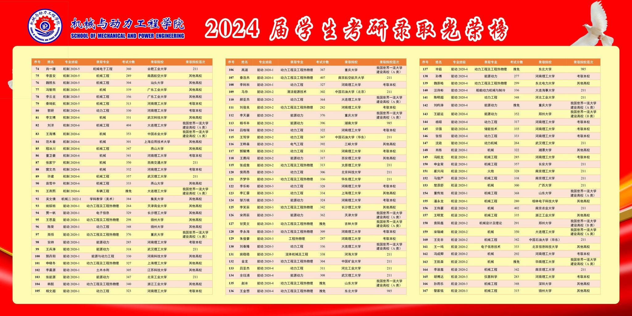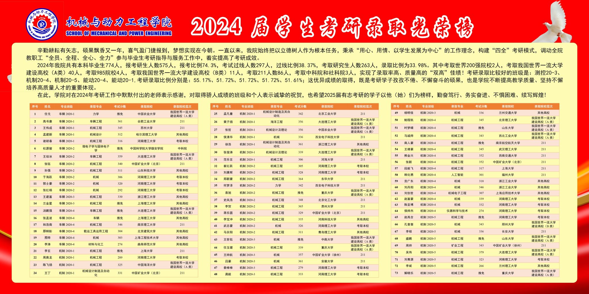 2024年我院共有本科毕业生774人,报考研究生人数575人,报考比例74.3%,考试过线人数297人,过线比例38.37%,考取研究生人数263人,录取比例为33.98%。其中考取世界200强院校2人,考取我国世界一流大学建设高校(A类)40人,考取985院校4人,考取我国世界一流大学建设高校(B类)11人,考取211人数86人,考取中科院和社科院3人,实现了录取率高、质量高的“双高”佳绩!考研录取比较好的班级是:测控20-3、机制20-4、机制20-5、能动20-4、能动20-1,考研录取比例分别是:55.17%、51.72%、51.72%、51.72%、51.61%;这优异成绩的取得,既是考研学子孜孜不倦、不懈奋斗的硕果,也是学院不断提高教学质量、坚持不懈培养高质量人才的重要体现。