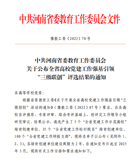3月29日,全省高校组织工作会议在郑州召开,省委教育工委专职副书记尹洪斌出席会议并讲话。会上公布了全省高校党建工作强基引领“三级联创”活动等评选结果。我院党委获评首批“全省党建工作标杆院系”。