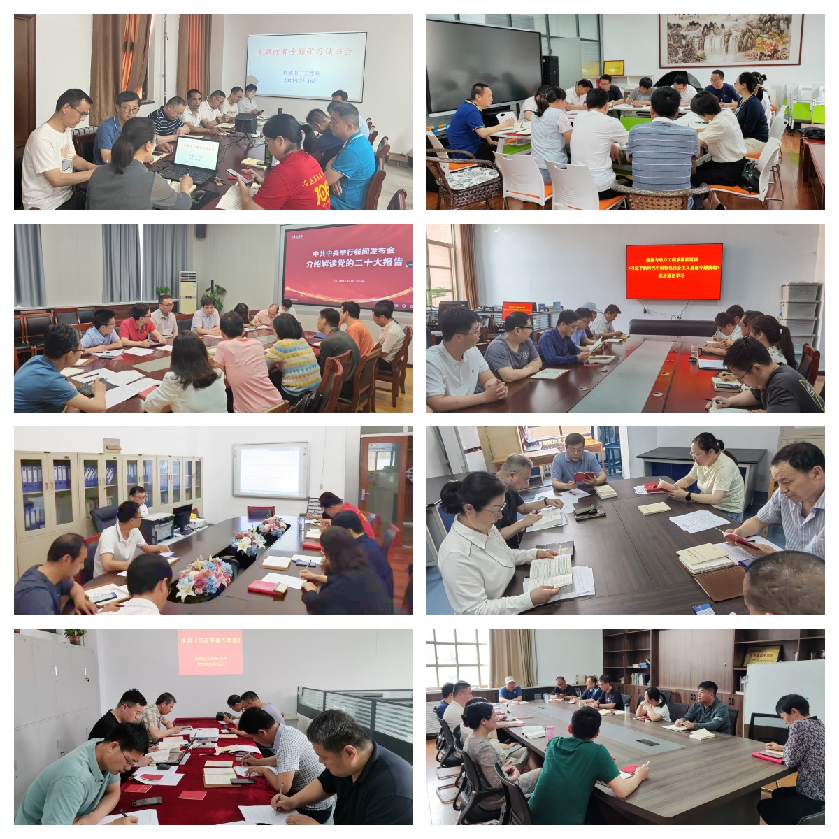 在读书会上,各支部采取支部书记领学,集体自学的方式,认真研读了《习近平著作选读》《习近平新时代中国特色社会主义思想专题摘编》、党的二十大报告、《中国共产党章程》……在集体自学过程中,大家一致认为,专题读书会这种学习方式有效的解决了过去学习碎片化,以及学的不深、不透、不系统等问题。大家纷纷表示,要牢牢把握“学思想、强党性、重实践、建新功”的总要求,从习近平新时代中国特色社会主义思想中汲取奋发进取的智慧和力量,立足岗位,主动作为,为实现学校“双一流”创建目标提供机械智慧、展现机械力量、做出机械贡献。